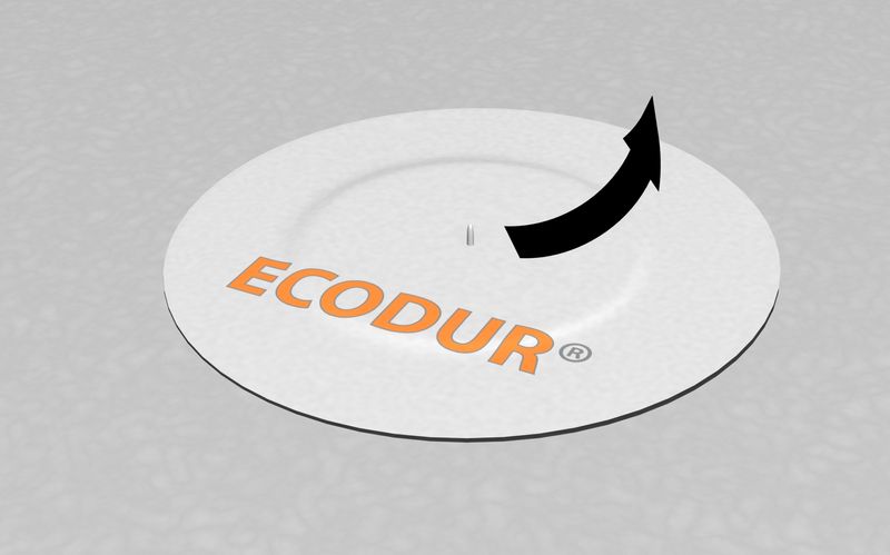 Ta bort releasepappret från ena sidan, centrera och montera brunnsmanschetten så den sitter tillräckligt för att du ska kunna riva bort releasepappret på ovansidan. Riv sedan bort releasepappret på ovansidan lägg över ECODUR® Tätfolie och gnid sedan ordentligt. ECODUR® Brunnsmanschett Dubbelhäftande E.V.A. ska alltid placeras under ECODUR® Tätfolie.
