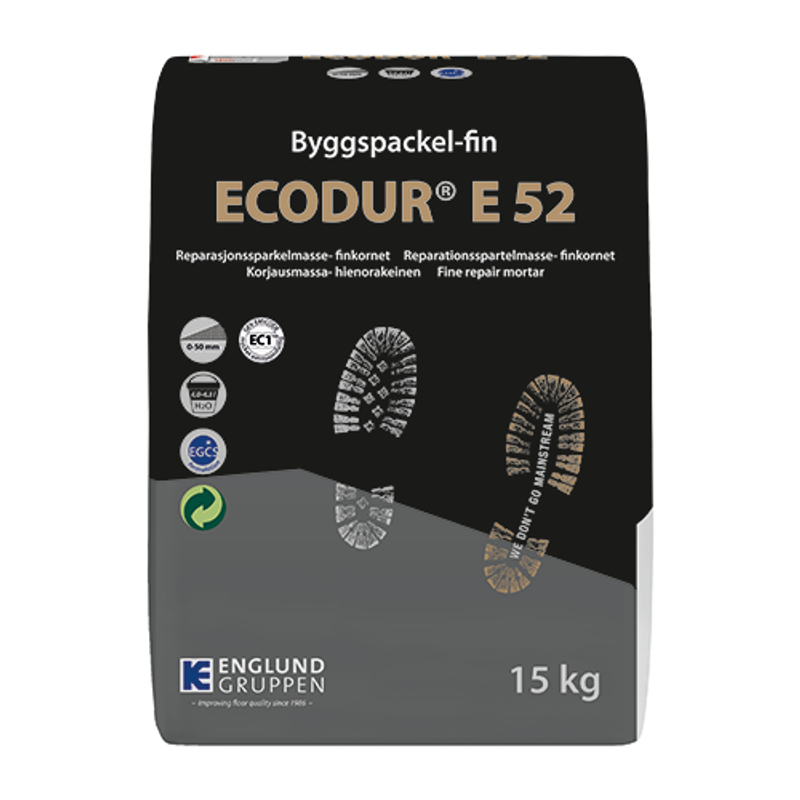 Blanda endast så mycket material som kan läggas inom användningstiden. Idealisk läggningstemperatur är 15-25°C. Hög temperatur förkortar, låg temperatur förlänger användnings- och härdningstiden. Sommartid skall därför materialet lagras svalt och kallt vatten användas. Lägg ut ECODUR® E 52 i lämplig lagtjocklek, låt materialet sätta sig i ca 5 minuter och finjustera därefter ytan med en slät spackelspade. Nylagda golvytor skyddas mot frost, drag och solbestrålning. Alltför snabb torkning kan medföra sprickor, deformation eller försämrad ythållfasthet.