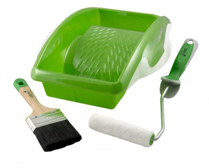 Roller- och penselset som gör det enkel att applicera i tunna skikt. Ergonomiskt utformat tråg som kan vila på armen när arbetet utförs. Extra lätt rollerbygel med gummigrepp.